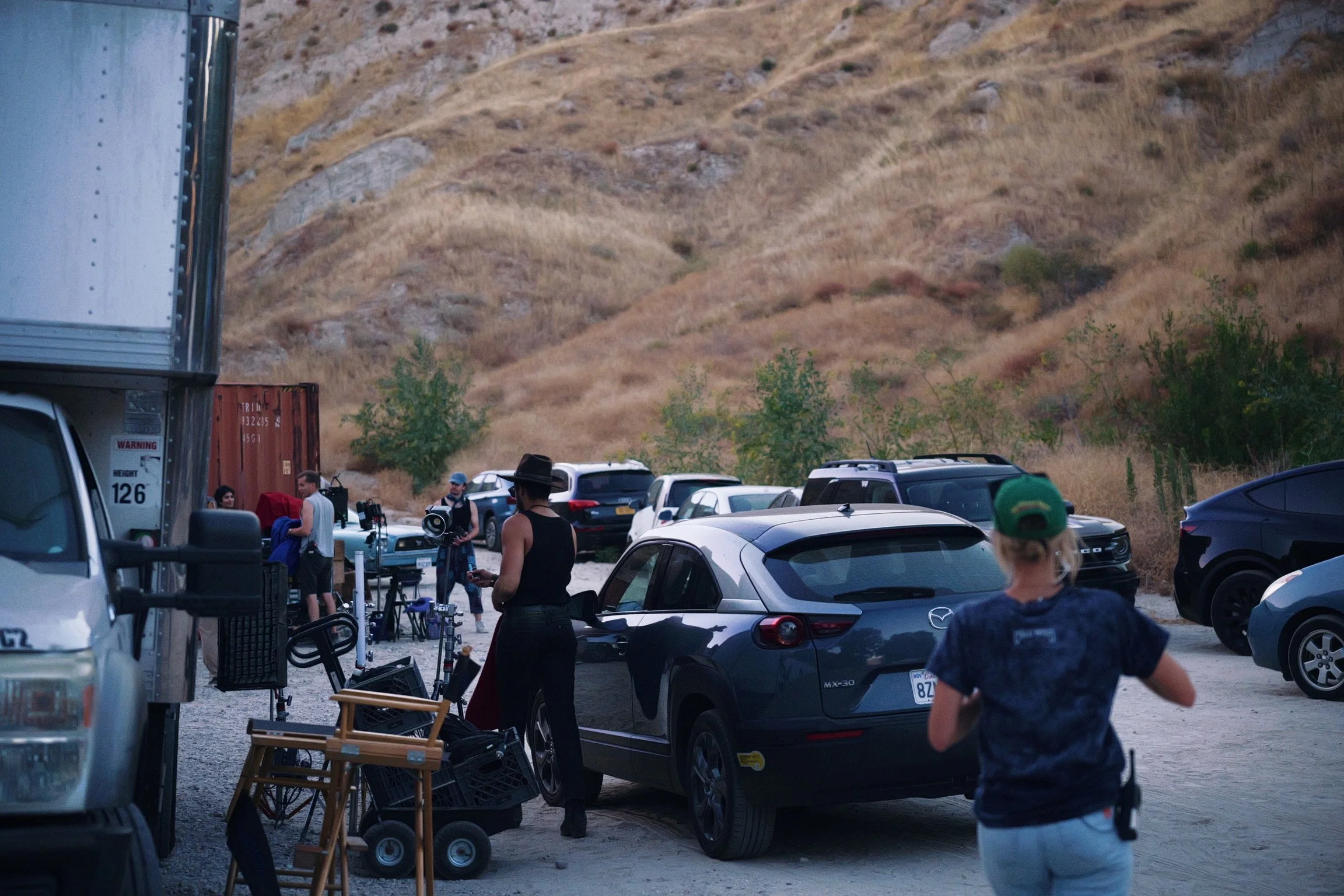 People filming on a film set in a parking lot with hills in the background.