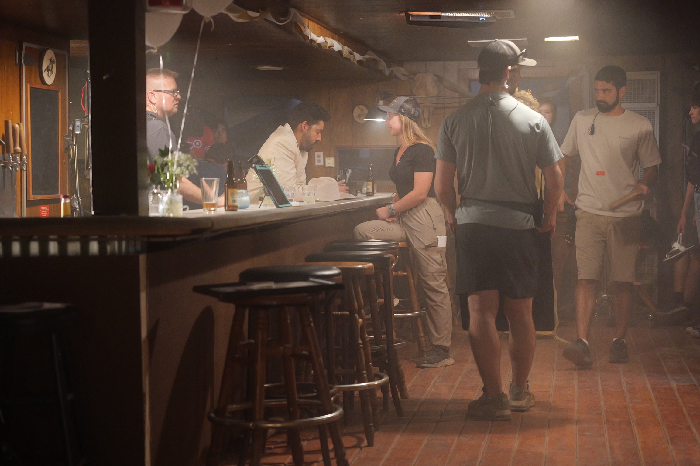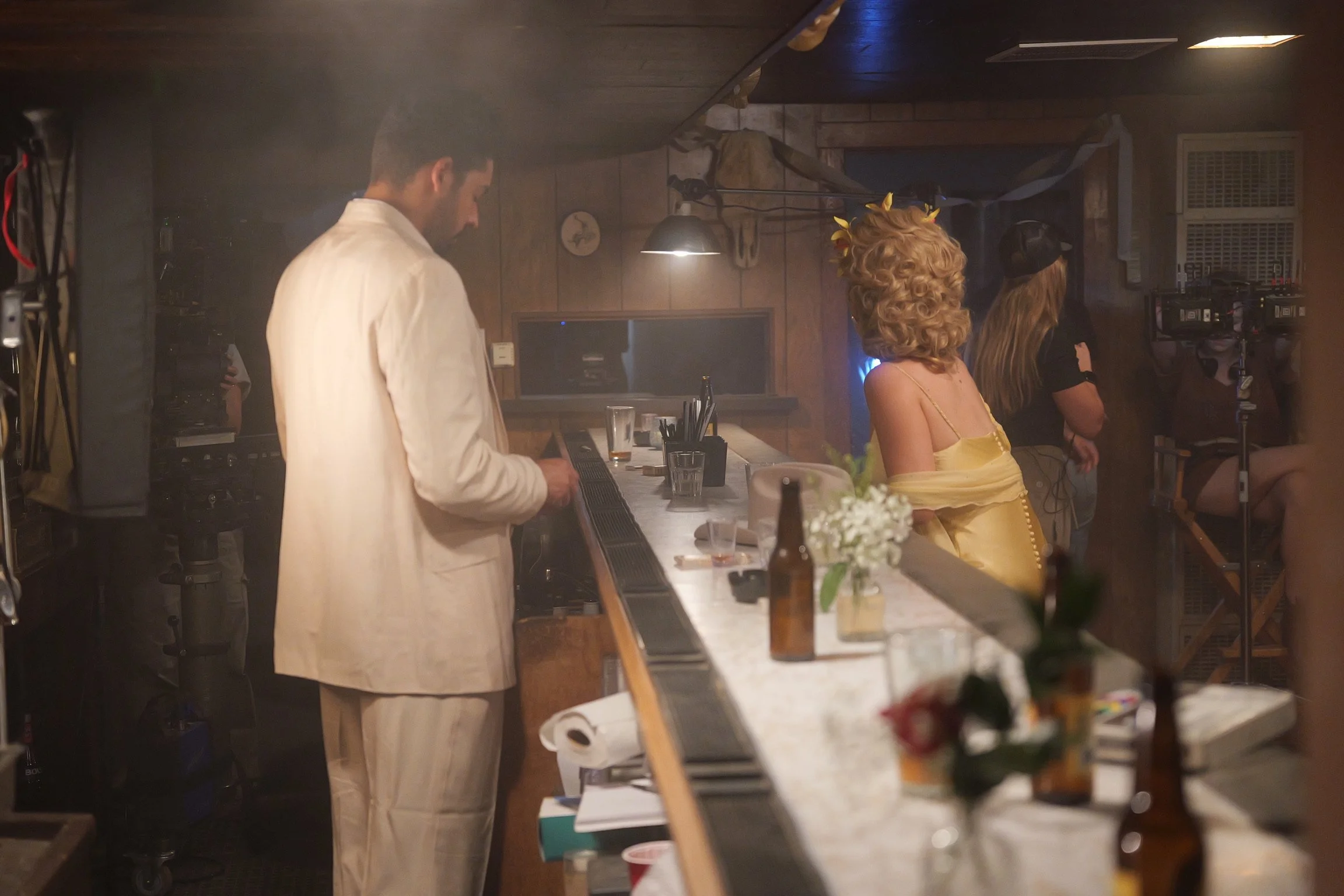 People filming a scene in a bar with a man in a cream suit, a woman in a yellow dress with a flower crown, and crew members.