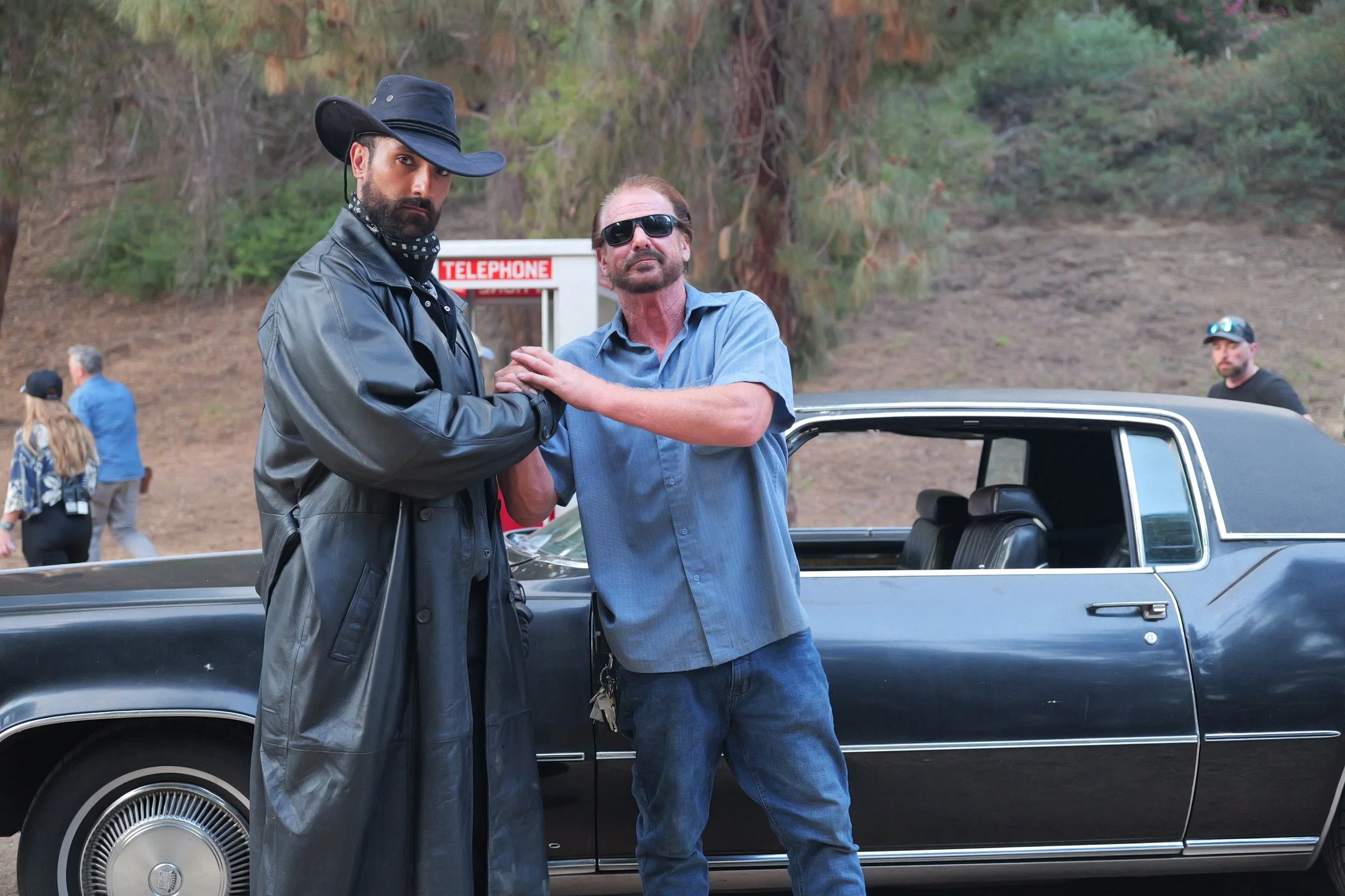 Two men are standing in front of a classic black car on a hillside. One man is wearing a black cowboy hat, black jacket, and gloves, while the other is wearing sunglasses and a blue shirt. They are holding hands in a handshake or fist bump. In the ba