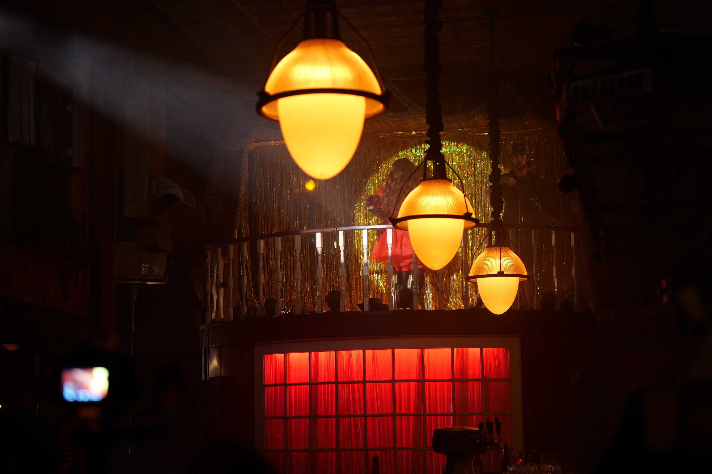 Dimly lit scene with three hanging yellow-orange lamps, a red curtain below, a glittery background with gold decorations, and a balcony with two people, one holding a microphone, in a nightclub or bar setting.