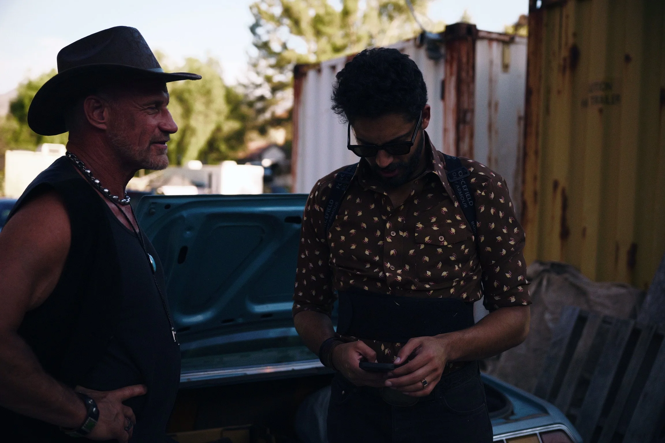 Two men standing beside an open car trunk outdoors during daylight, one is wearing a hat and necklace, the other is looking at a phone and wearing sunglasses and a patterned shirt.