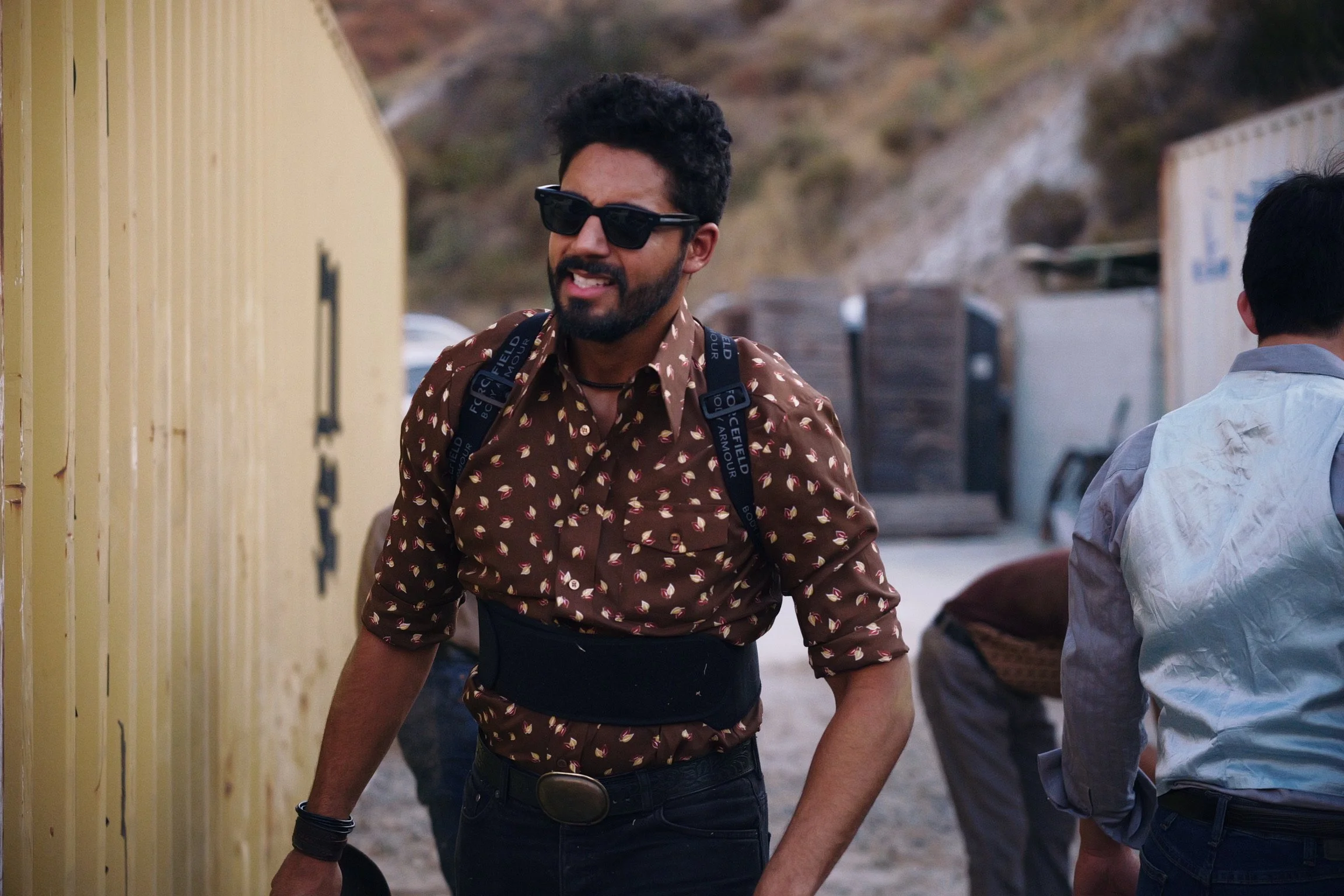 A man with dark hair, beard, wearing sunglasses, a patterned brown shirt, and a camera strap around his neck, smiling outdoors near a yellow wall and other people.