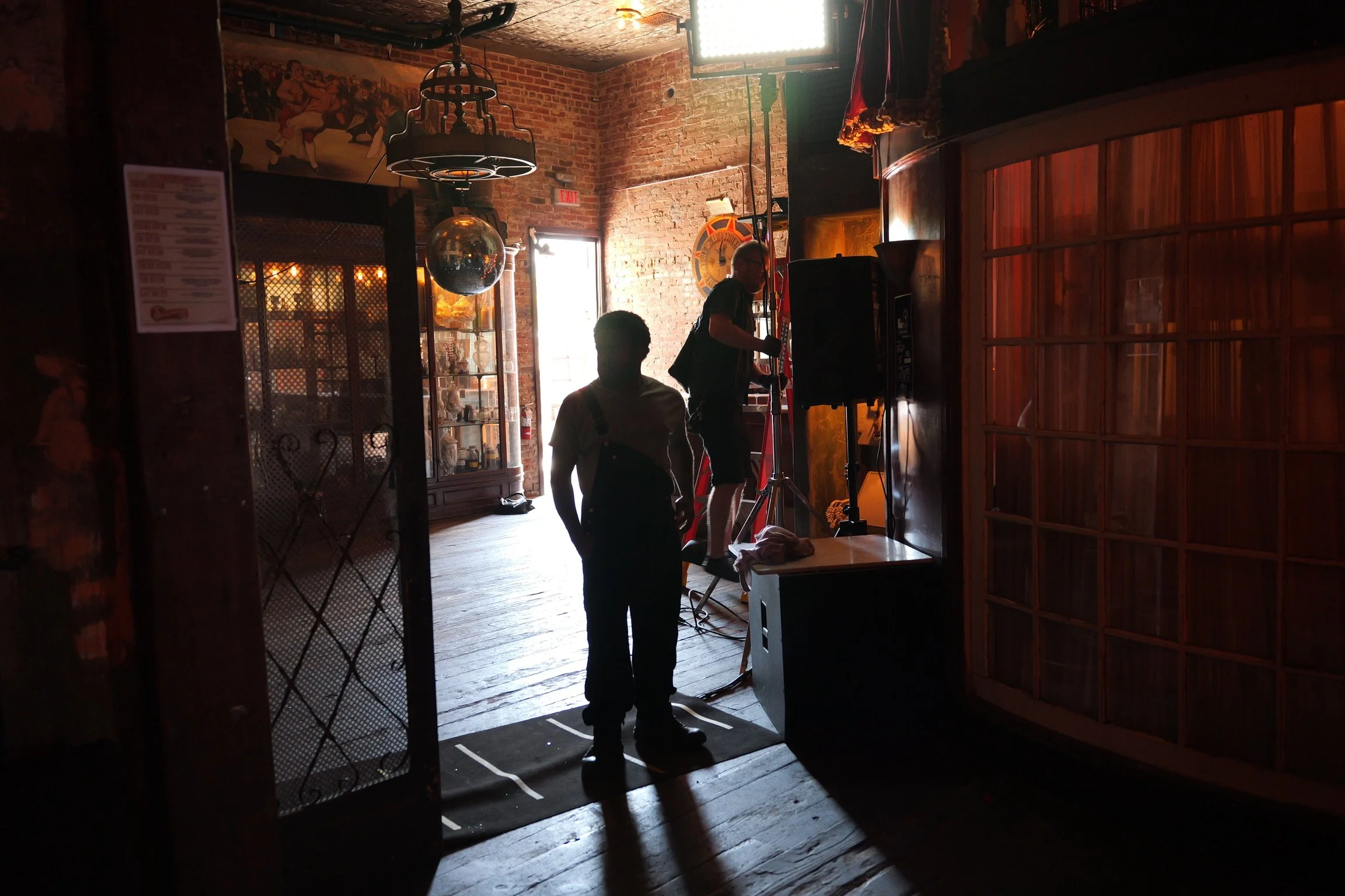 Silhouette of two people, one standing in the foreground and one on a ladder, in a dimly lit room with exposed brick walls, wooden floors, and vintage decor. Light coming through the open door creates a backlit scene.