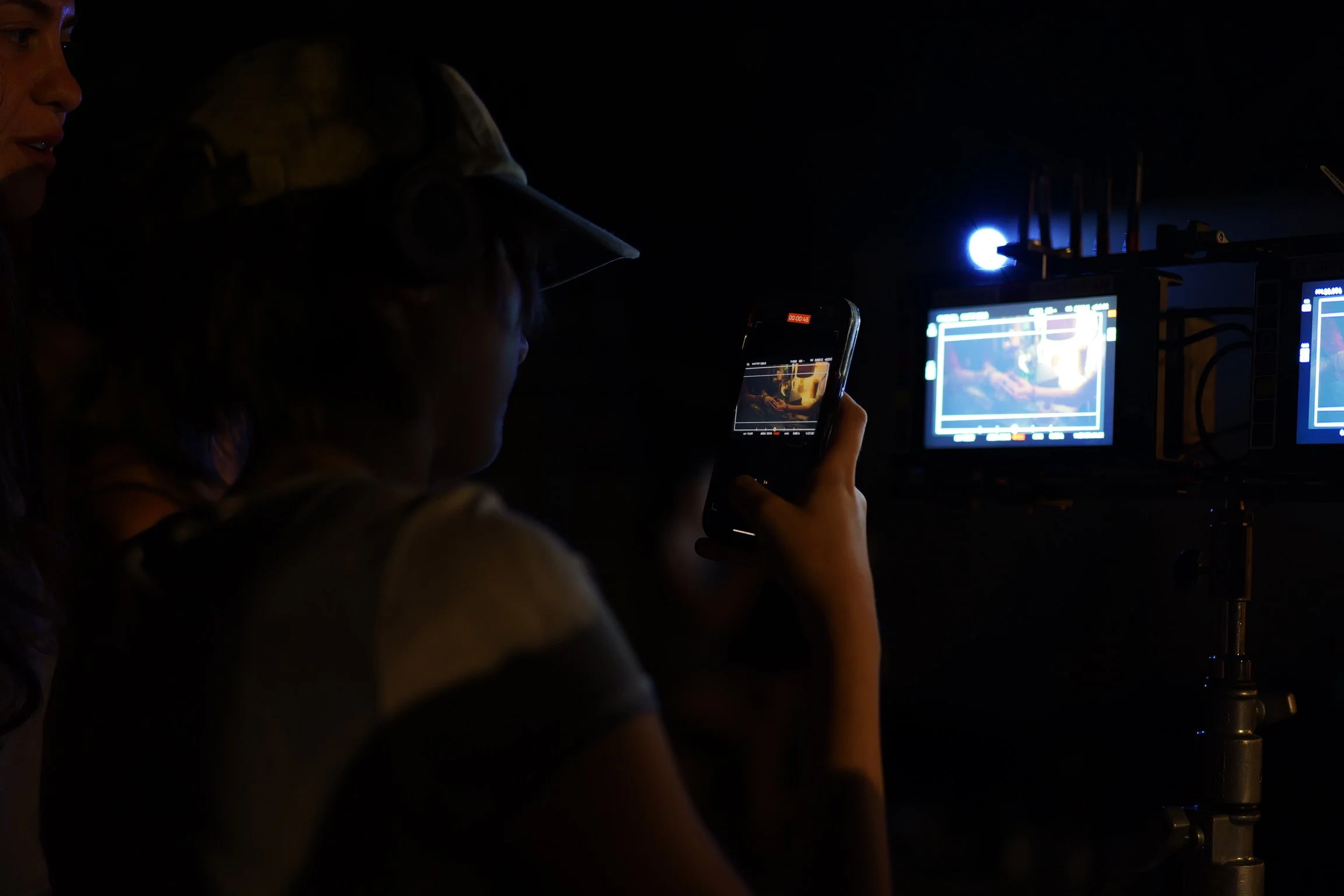 Two people, one wearing a hat, are on a film or video set in a dark environment. One person is filming with a smartphone, and there are two monitors displaying the scene being recorded.