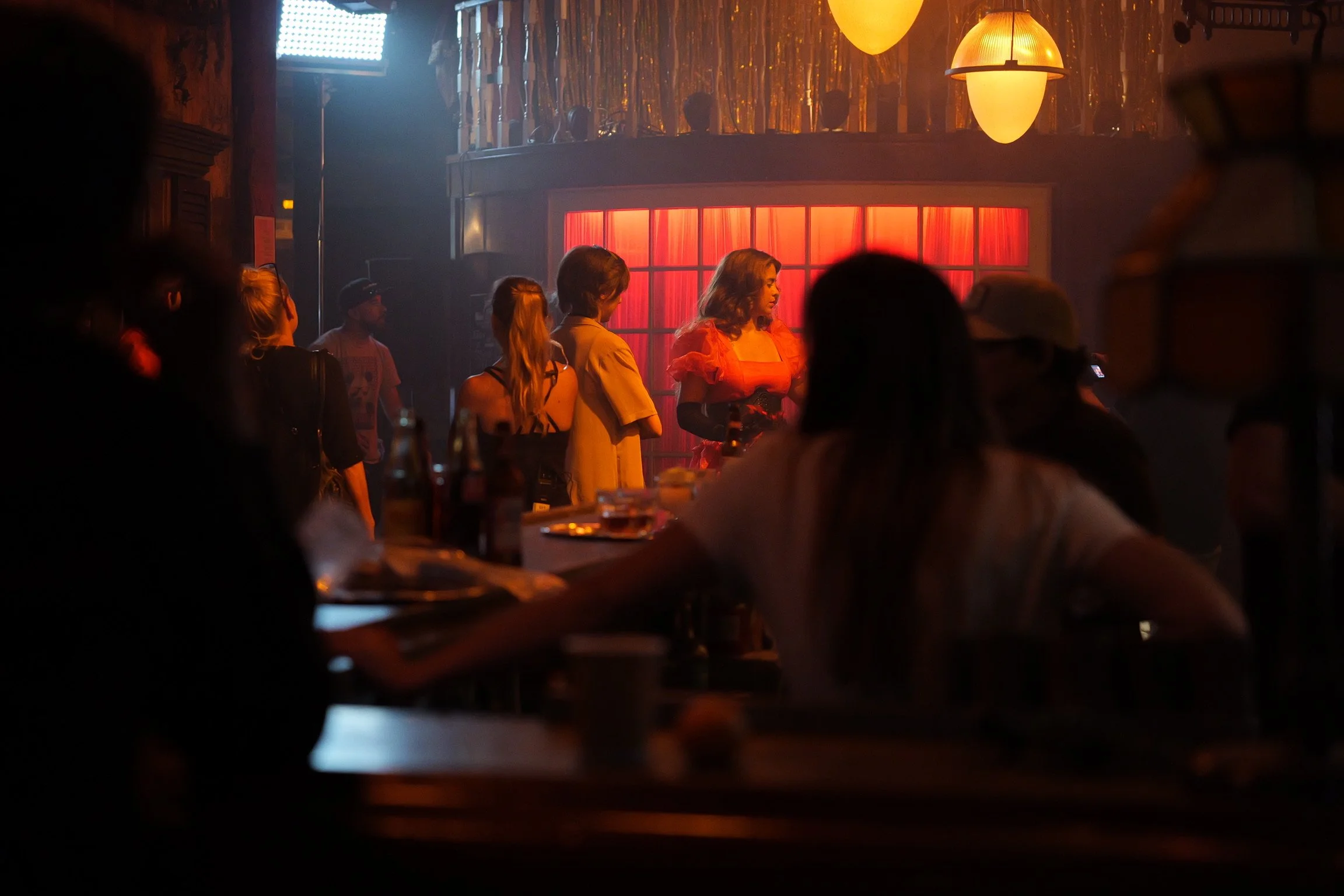 A person with long hair sitting at a bar, with a camera on a tripod pointed towards them, capturing a scene in a dimly lit setting with red and orange lighting.