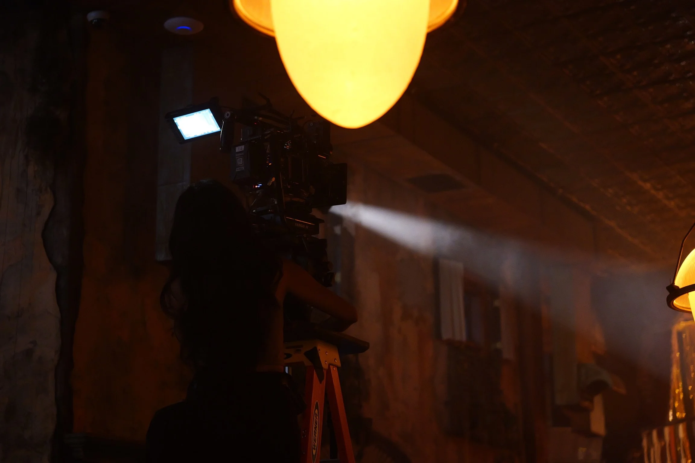 Silhouette of a person operating a video camera on a tripod in a dimly lit room with warm lighting and ceiling lamps.