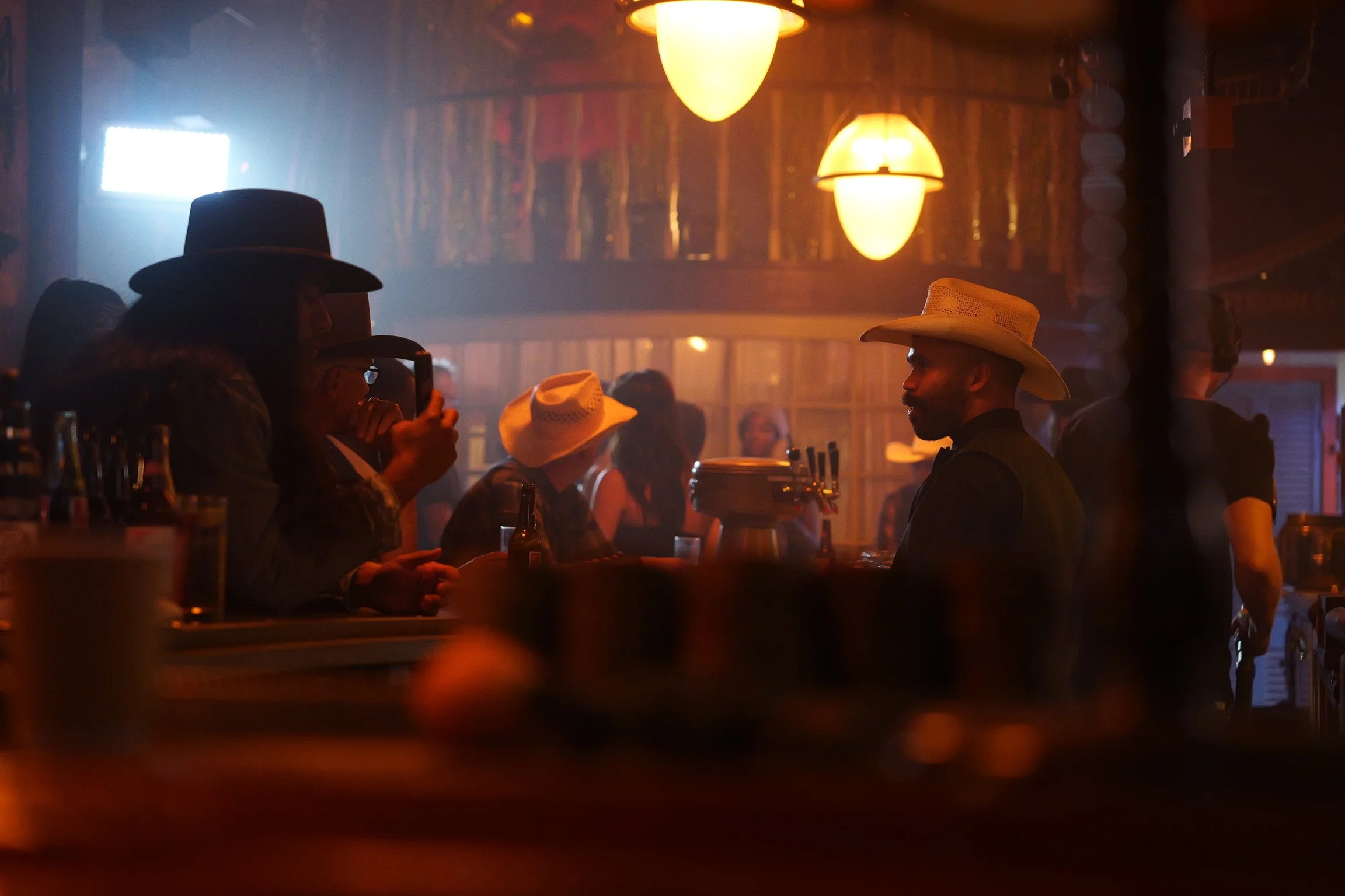 A dimly lit bar with people wearing cowboy hats, some sitting at the counter and others standing, engaged in conversation.