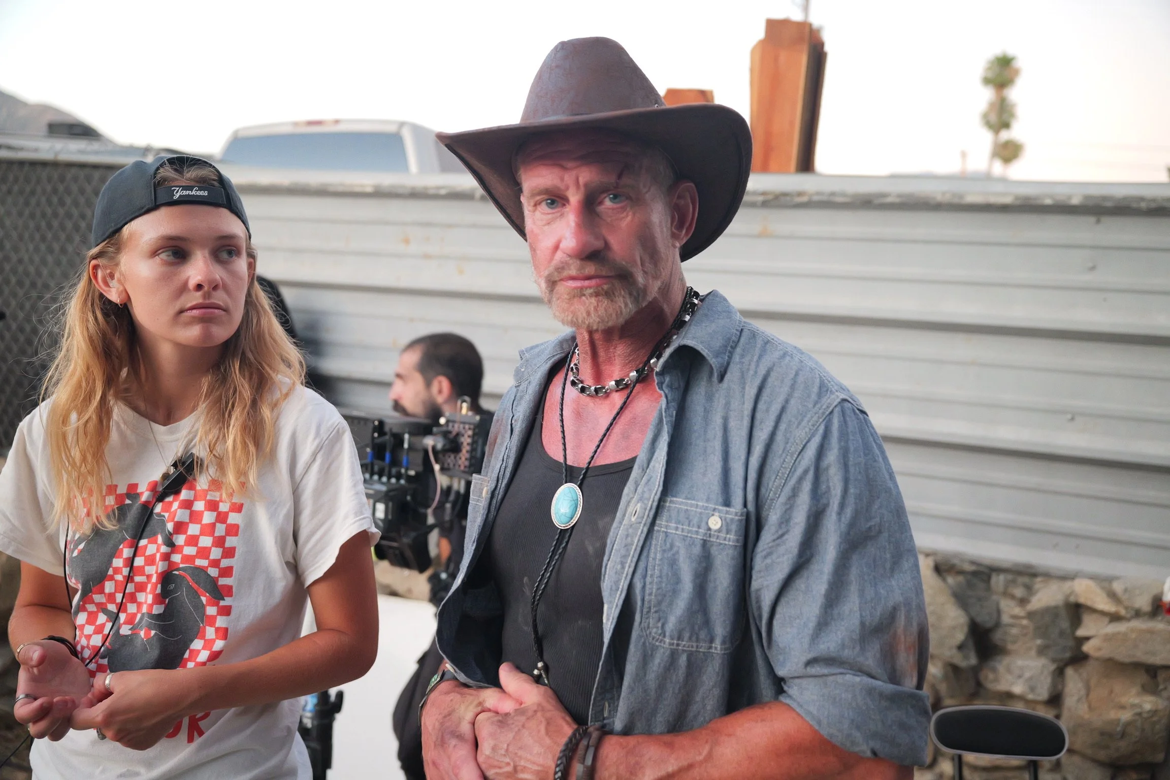 A man wearing a black cowboy hat and a denim shirt, with jewelry including a turquoise pendant necklace, standing next to a young woman with blonde hair, a backwards baseball cap, and a white T-shirt featuring a graphic. They are outdoors, with other