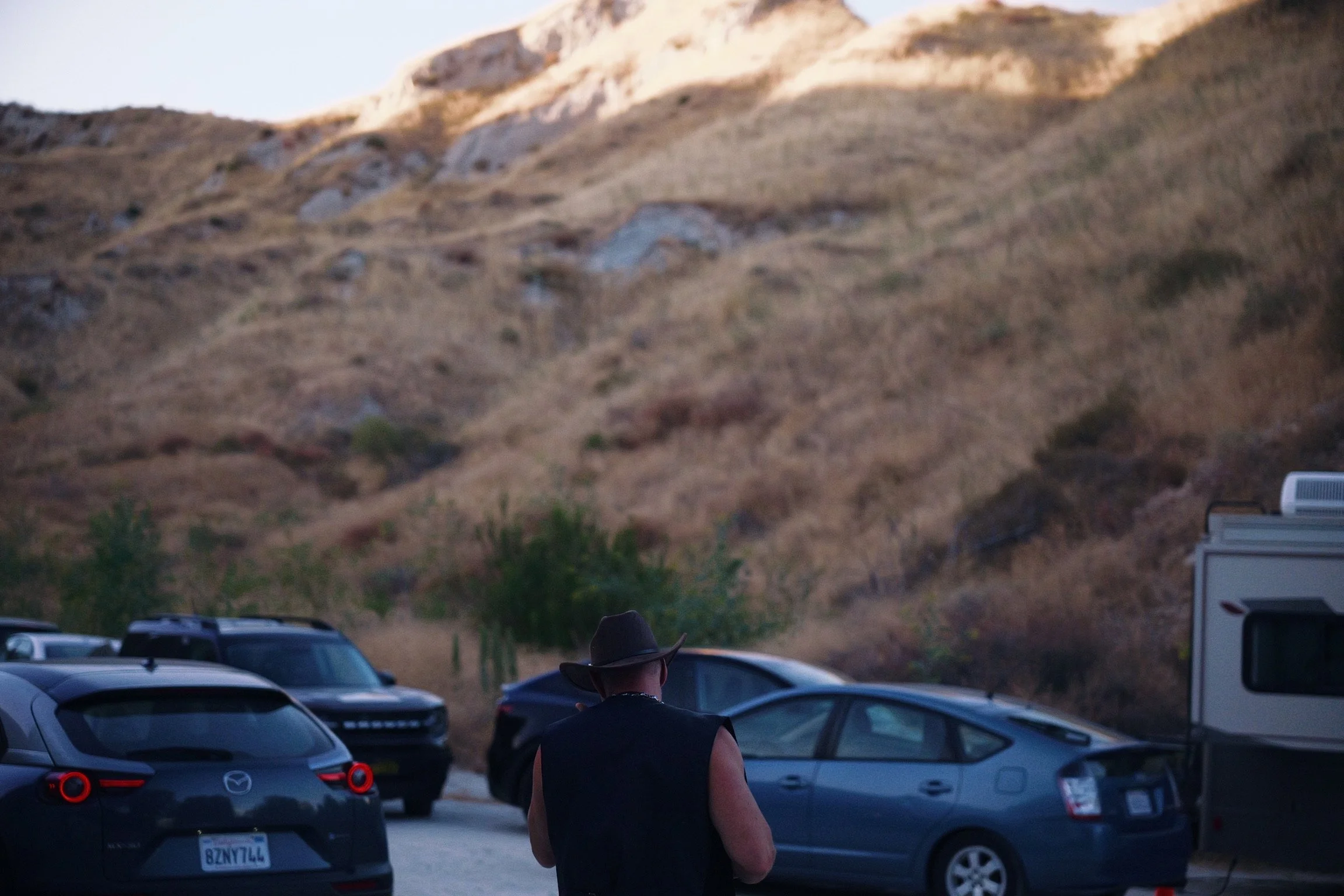 Person wearing a hat and sleeveless shirt standing in a parking lot with several cars, with a dry, hilly landscape in the background.