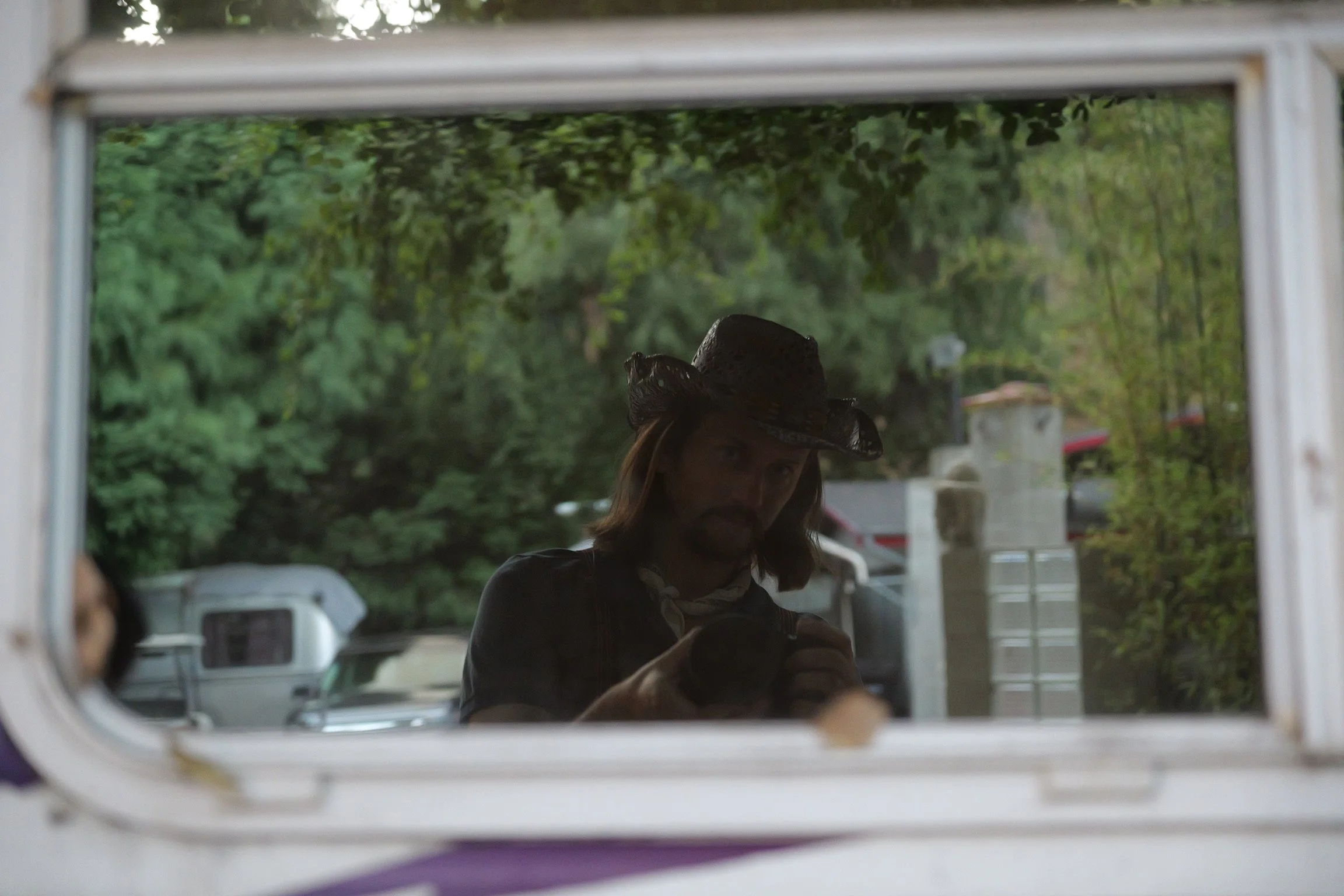 Reflection of a man wearing a cowboy hat taking a photo, seen in a reflective surface, with trees and vehicles in the background.