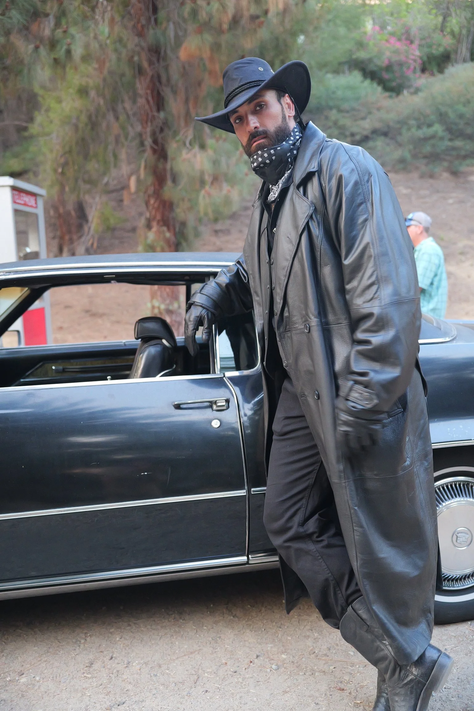 A man dressed in black leather coat, gloves, black hat, and bandana stands beside a black vintage car, in an outdoor setting with trees and a person in the background.