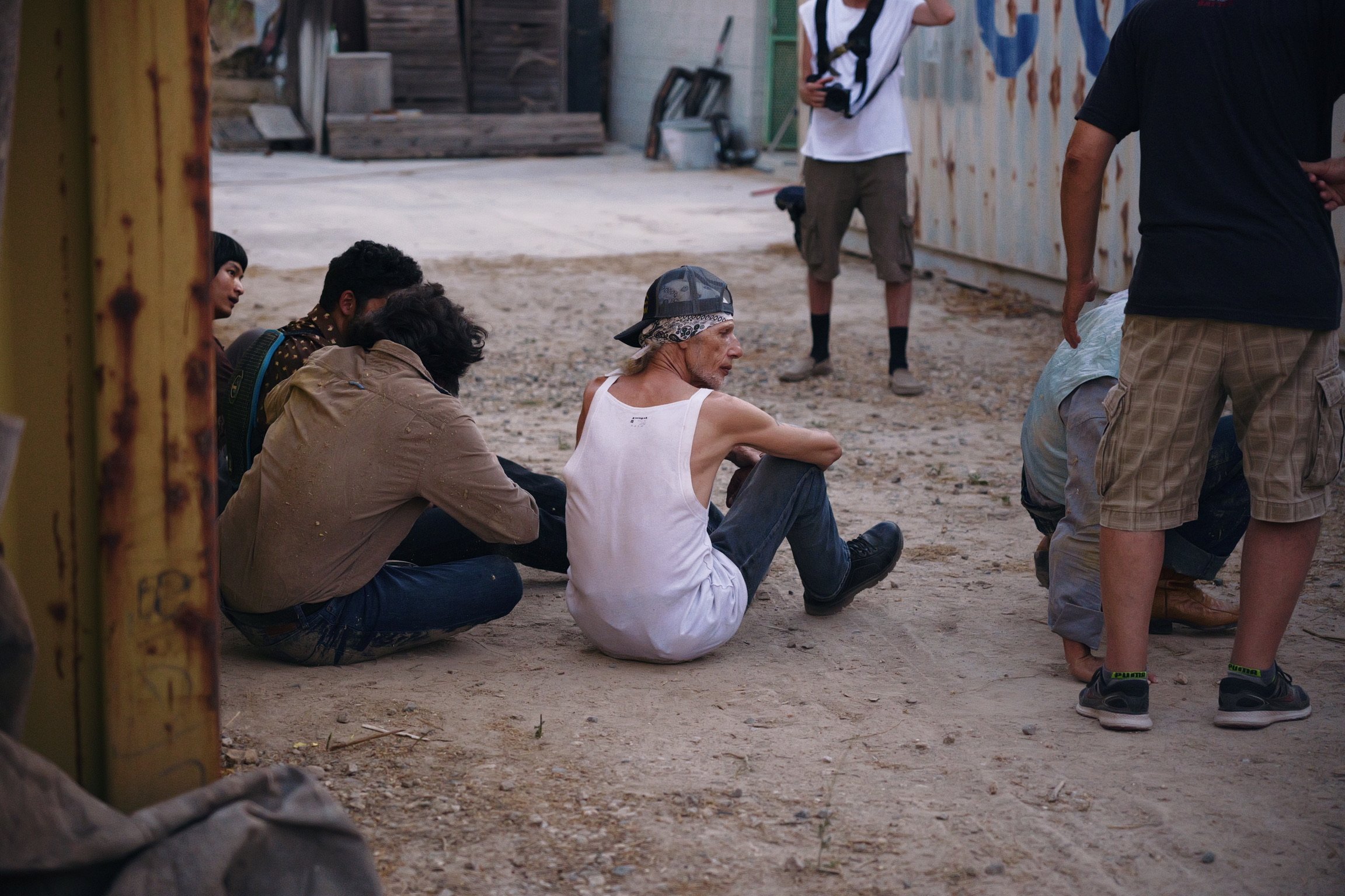 A man with a baseball cap and sleeveless shirt sitting on the ground, surrounded by other people standing or sitting, in a dusty outdoor area with makeshift structures in the background.