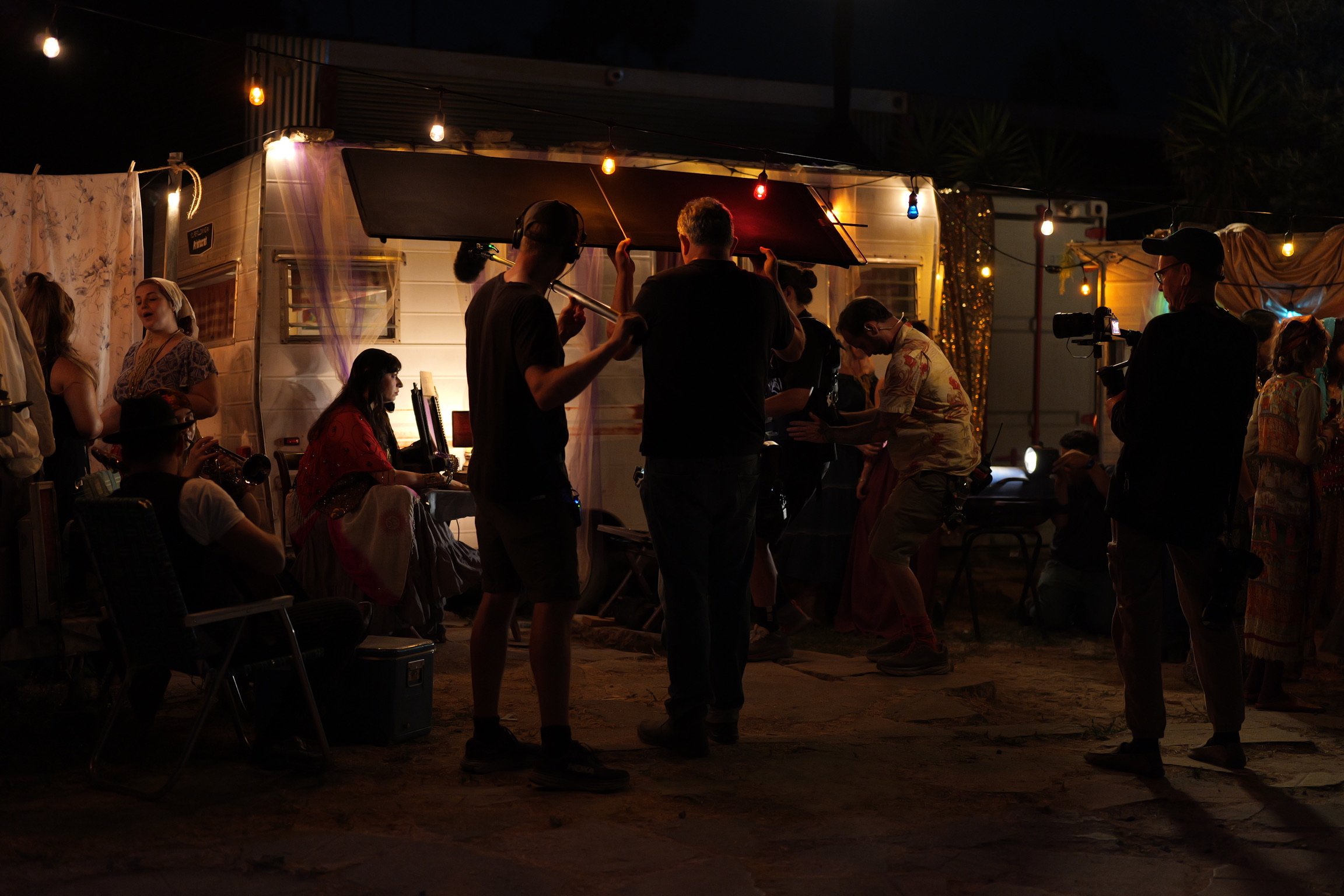 People filming and music performers at night with string lights and a trailer in the background.
