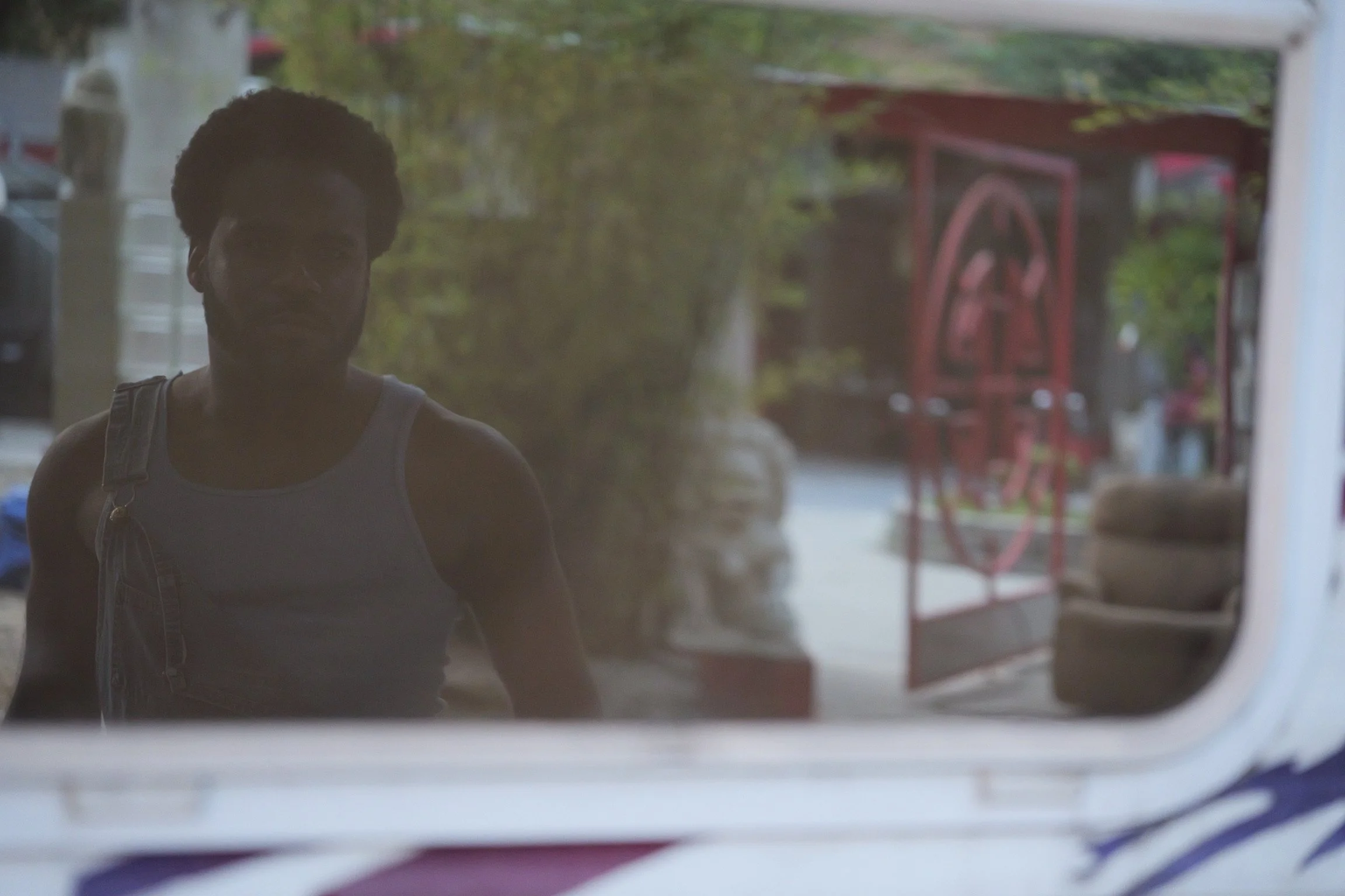 Reflection of a woman with short curly hair wearing a sleeveless shirt, seen through a glass window or mirror, with outdoor scenery and a red structure in the background.