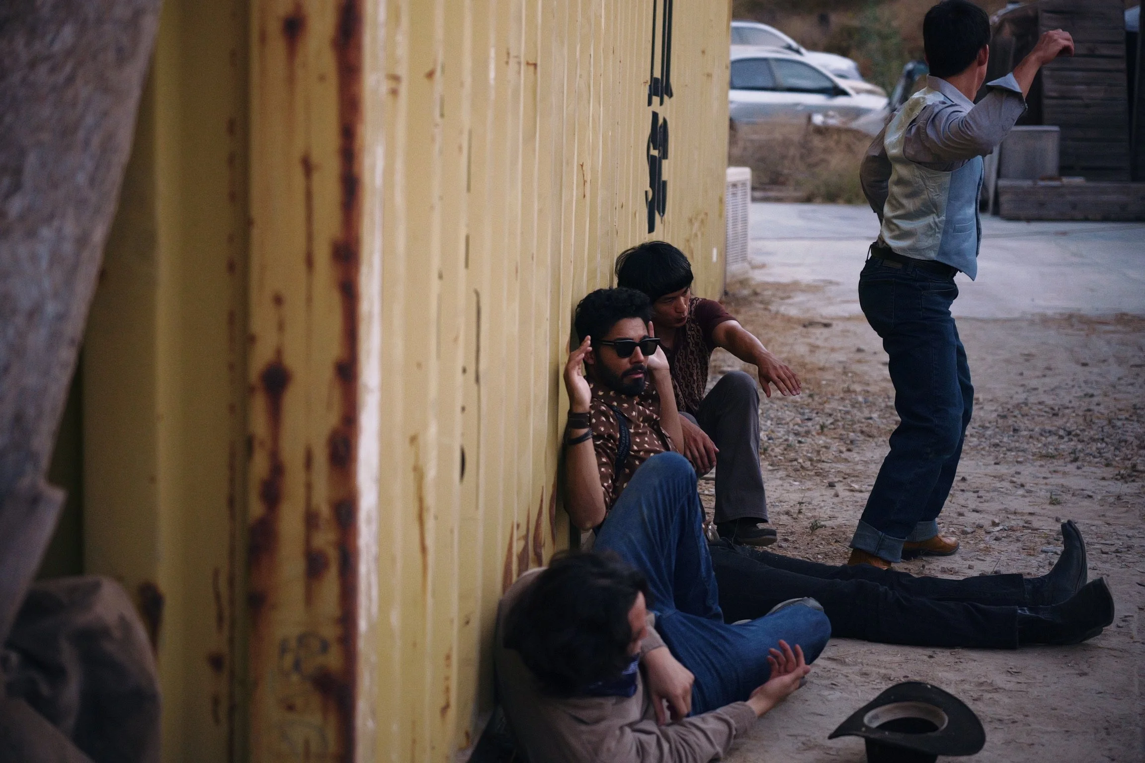 Four people sitting and standing against a yellow wall outdoors, some on the ground, one man wearing sunglasses, with cars in the background.