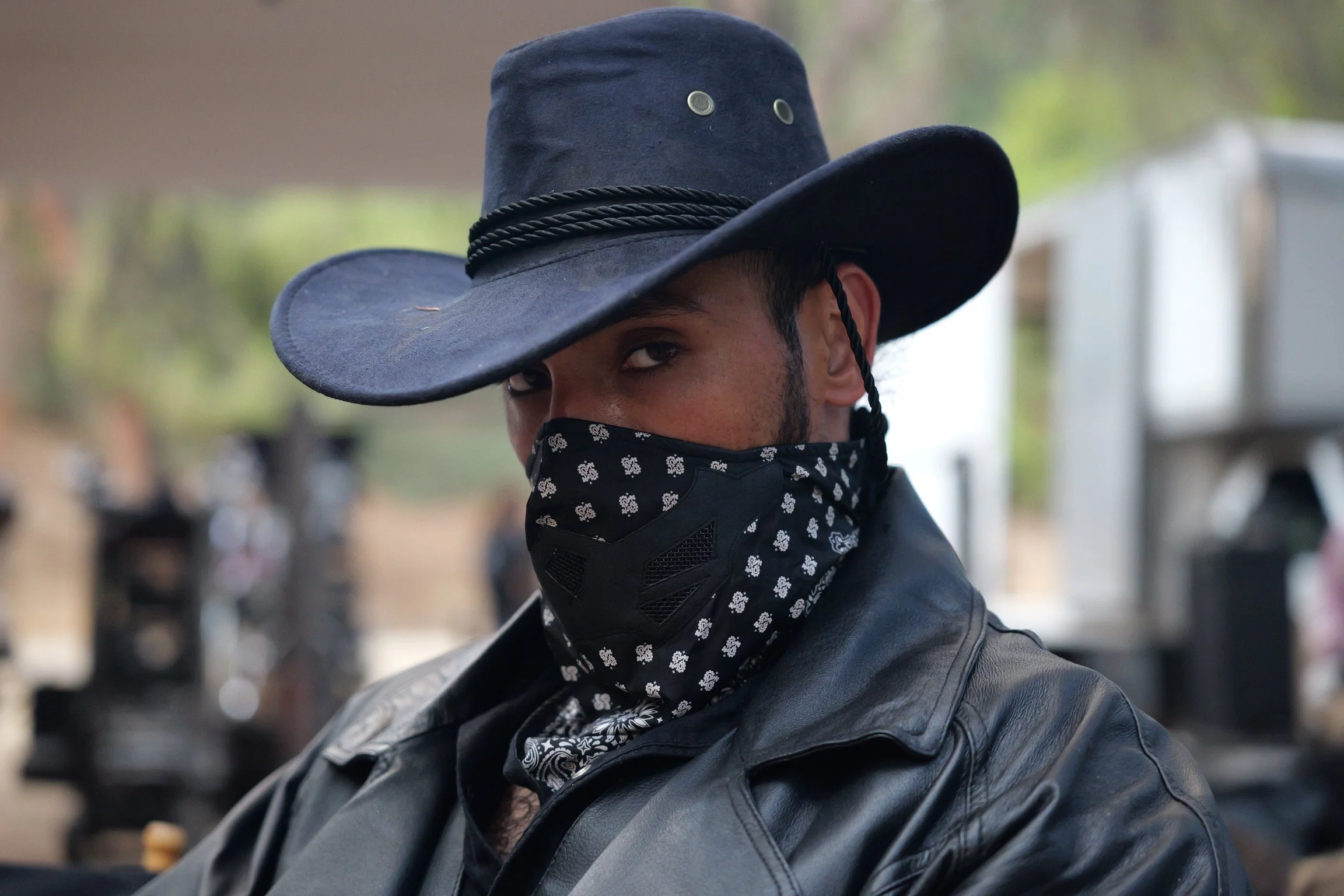 A man wearing a dark cowboy hat, a patterned face mask, and a black leather jacket, looking Over his shoulder with a serious expression.