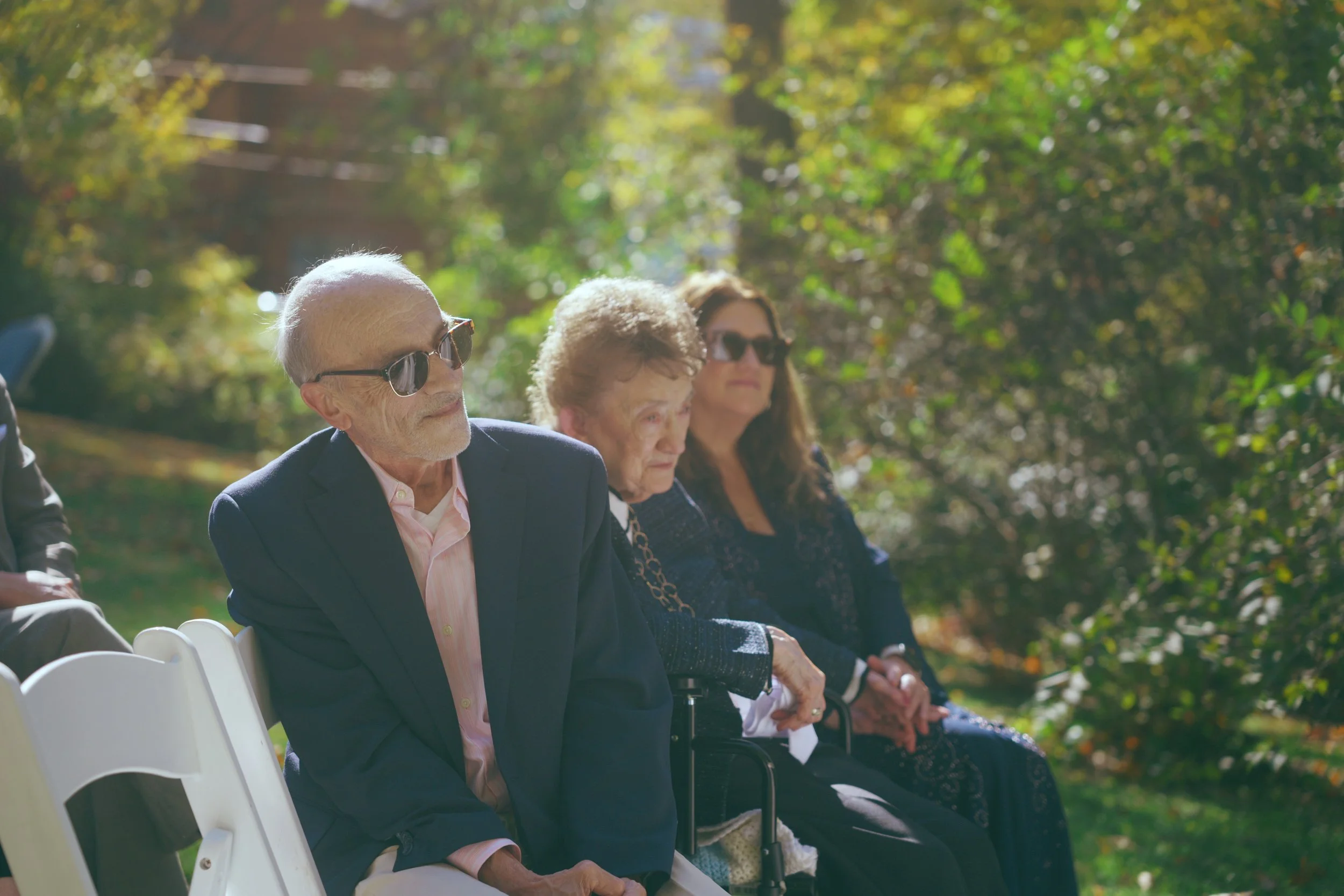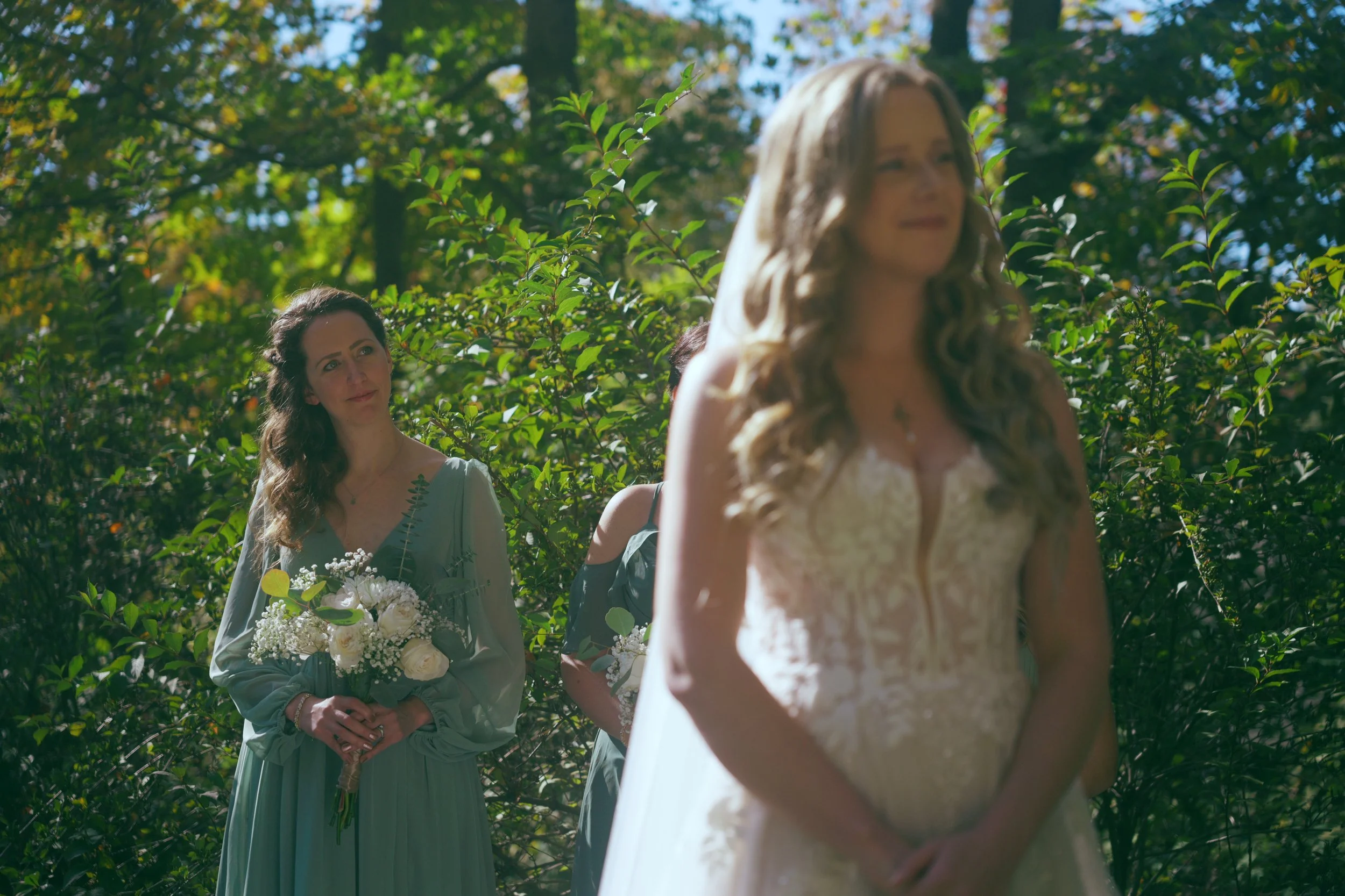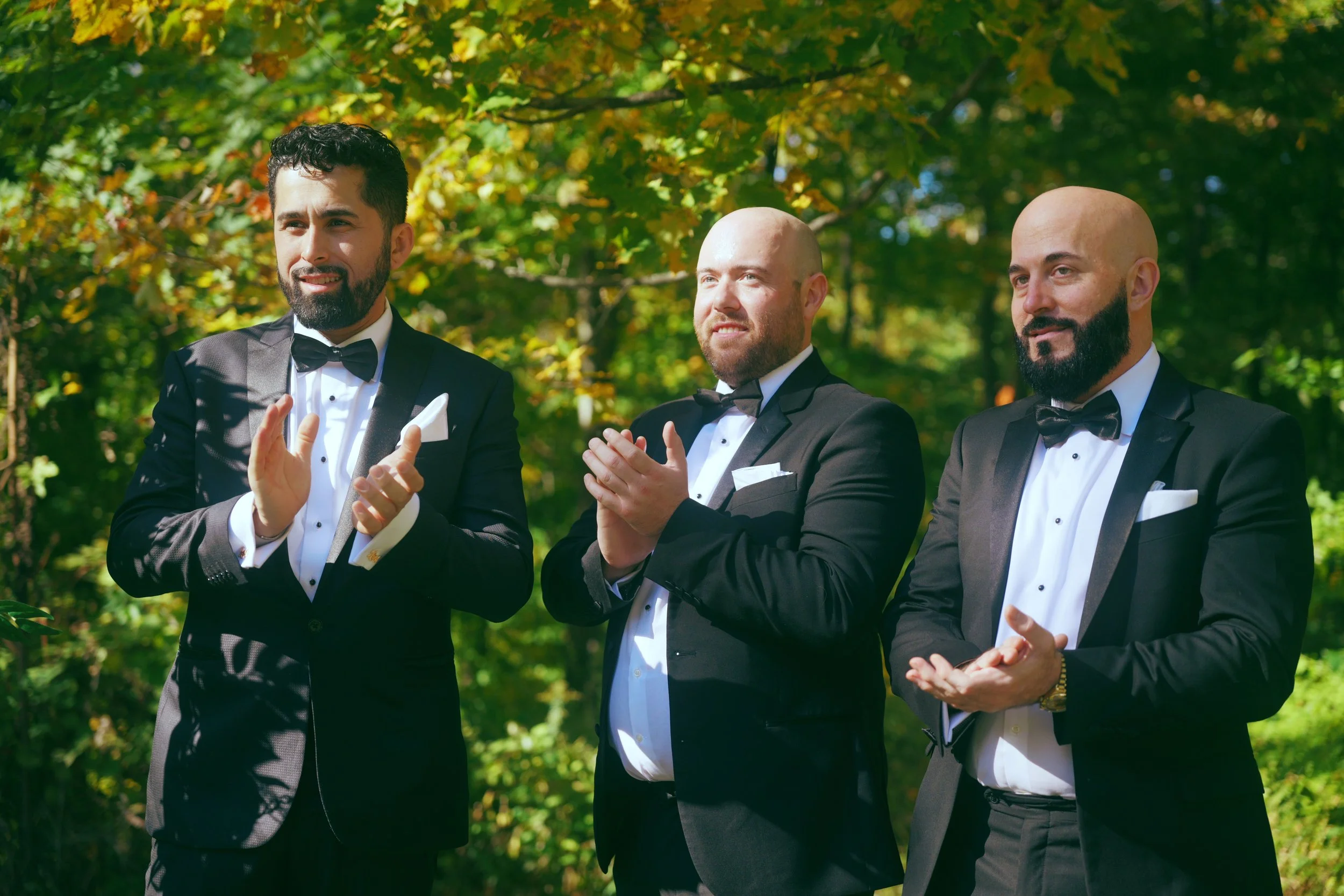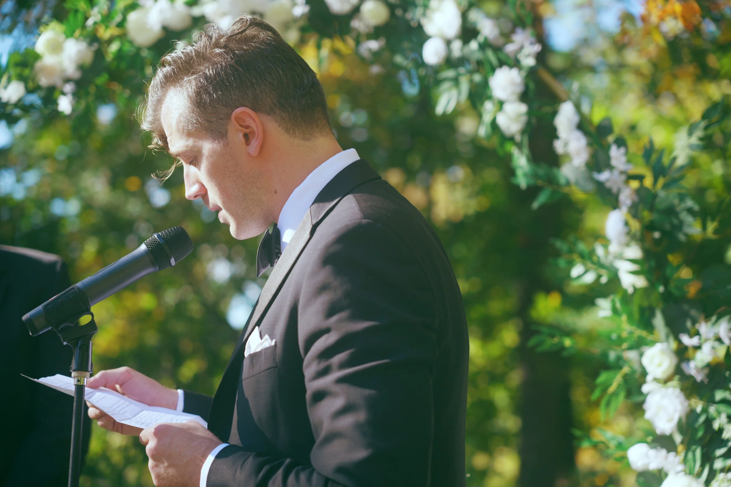 A man in a tuxedo with a black bow tie and white pocket square standing outdoors during a wedding ceremony with greenery and trees in the background.