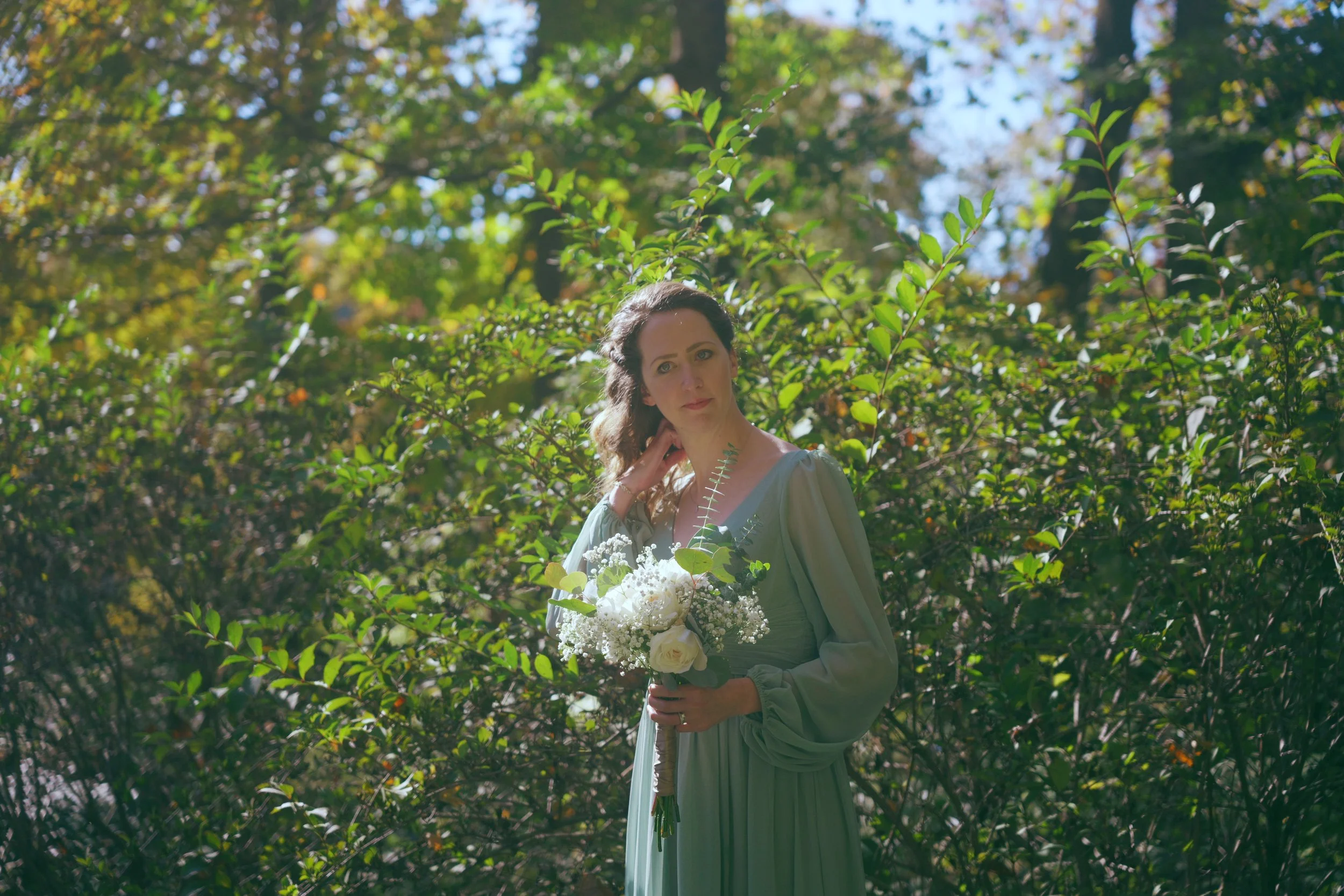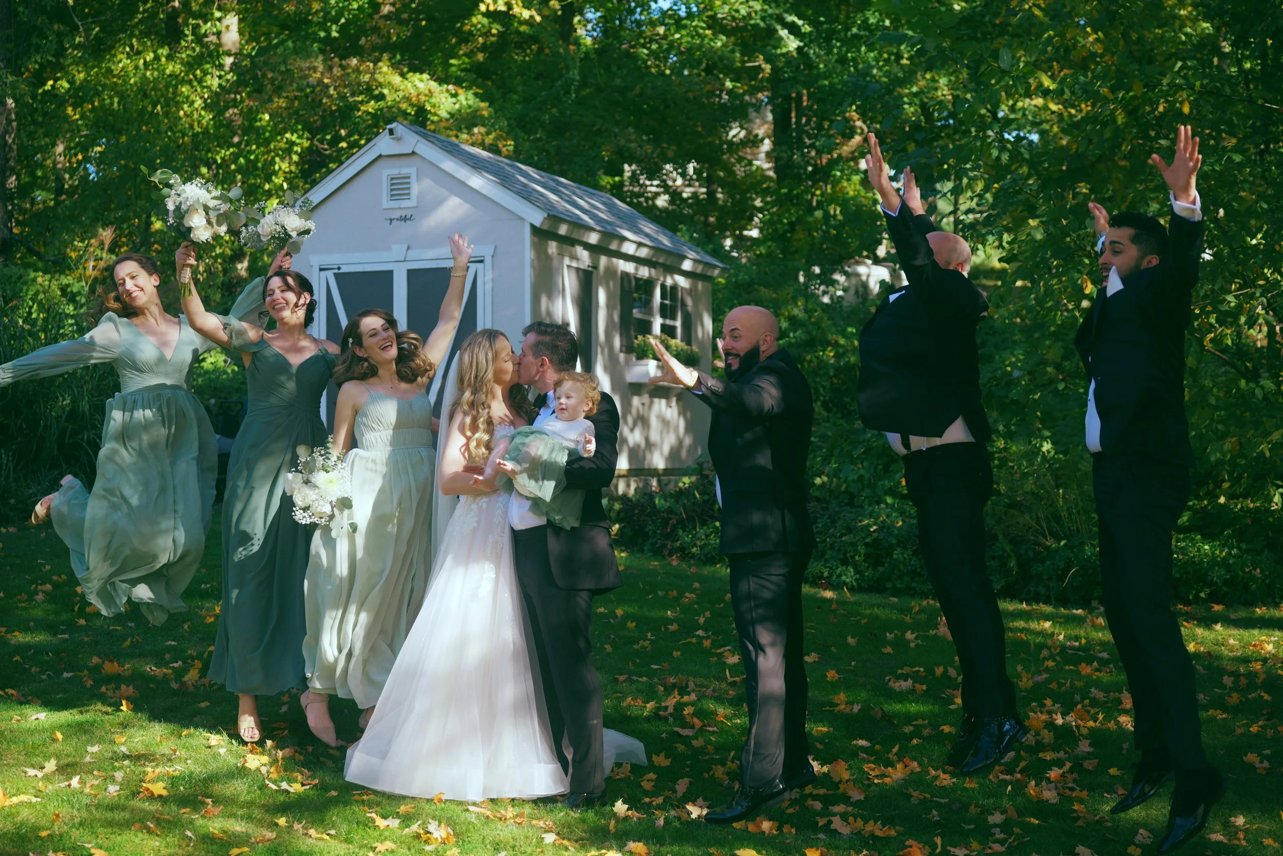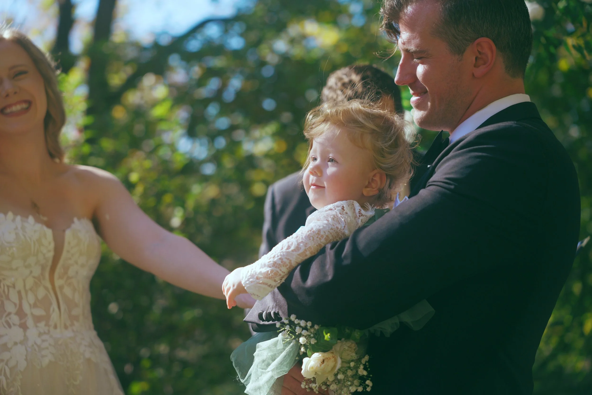 A bride and groom at a wedding ceremony outdoors, with the bride smiling and holding the groom's hand, while the groom holds a child in his arms, surrounded by greenery.