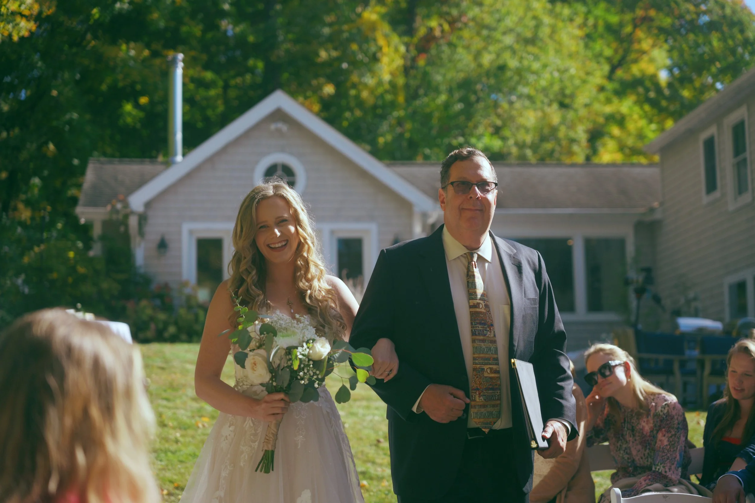 A man in a tuxedo holding a young girl in a white dress at an outdoor wedding ceremony, with floral decorations and greenery in the background.