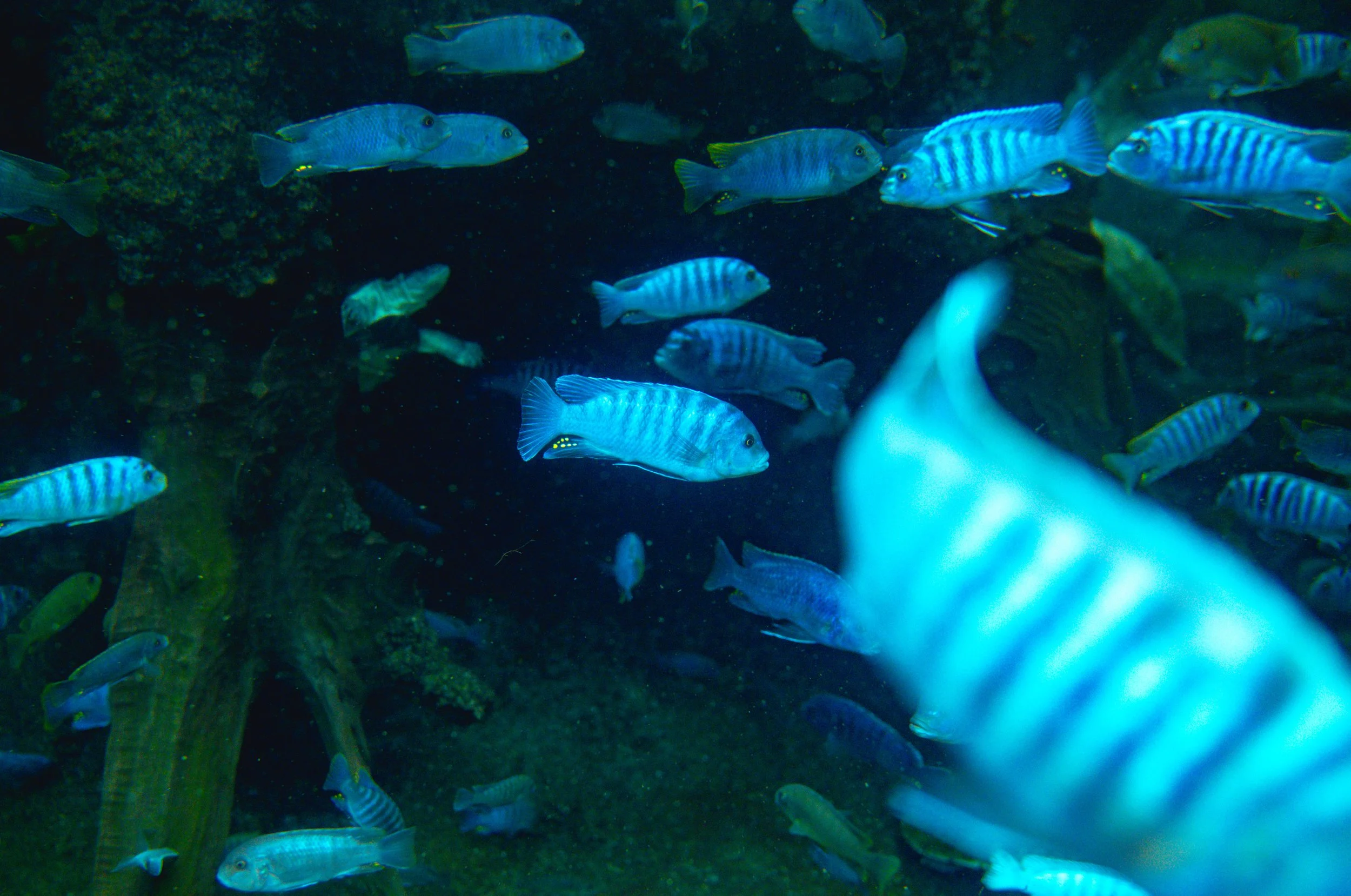 School of tropical fish swimming underwater in an aquarium, with blue and yellow fish and coral in the background.