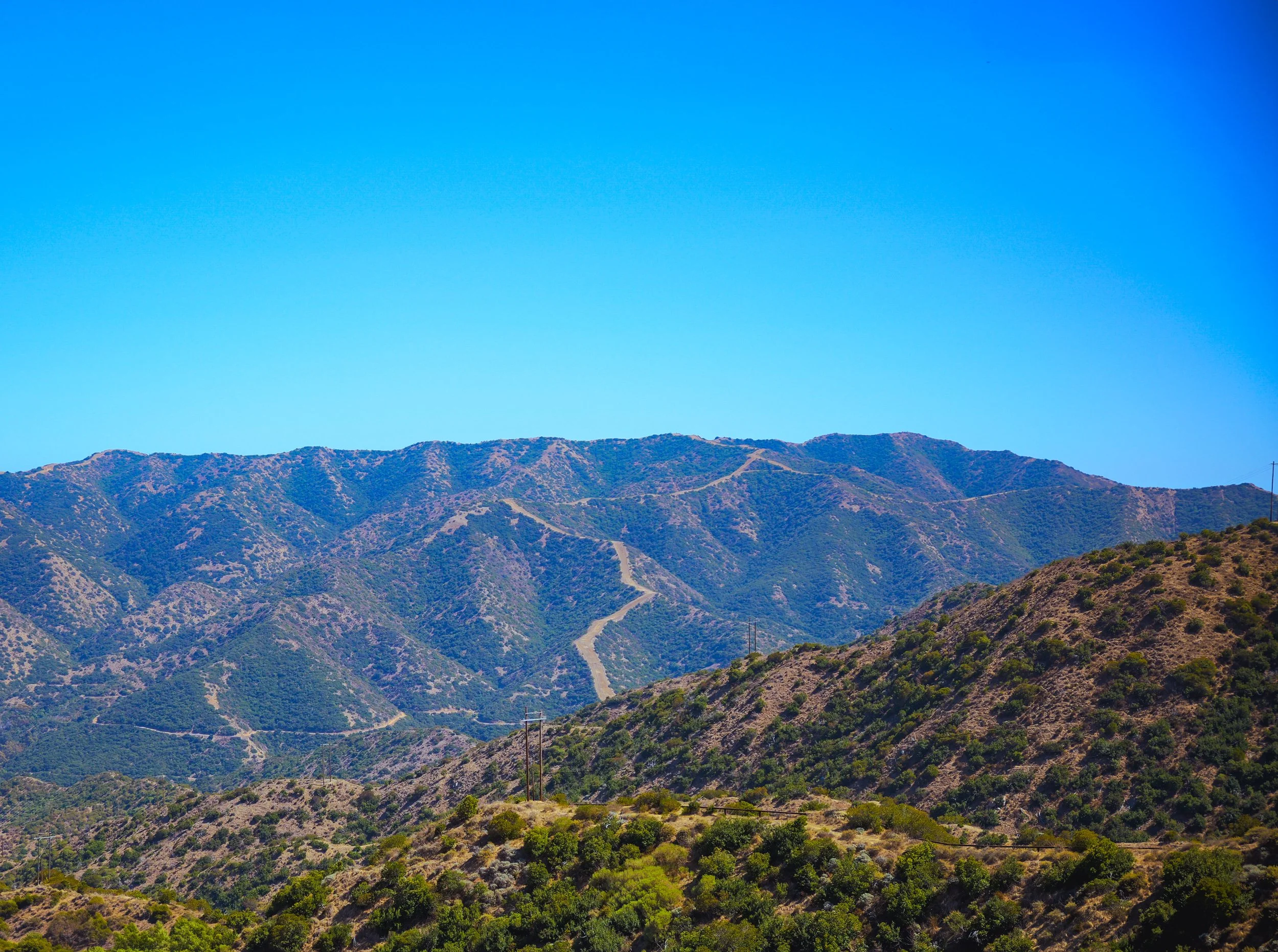 Landscape of rolling hills and mountains under a clear blue sky, with scattered vegetation and dirt paths visible on the terrain.