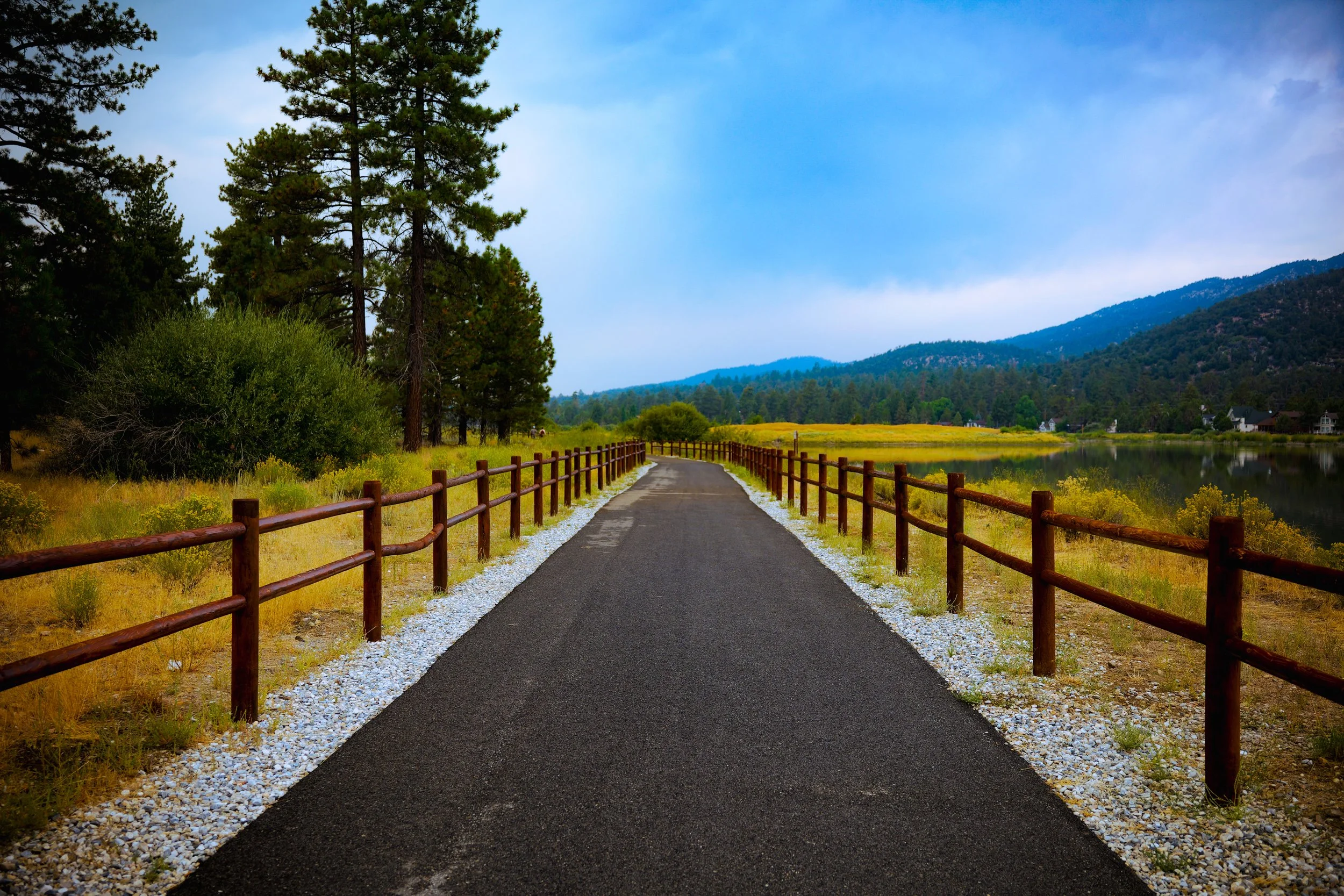A paved walking path with wooden fences on either side runs alongside a scenic lake, with trees and mountains in the background under a partly cloudy sky.